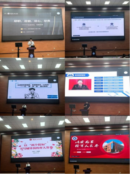 宣讲会上,6008集团官方网站软件工程训练中心葛亮、软件技术教研室冷亚洪、软件技术教研室孟高原、数字孪生产业学院虚拟现实技术系刘啸天、陈婷、数字孪生研究所任然、辅导员李晨燕老师围绕“立足岗位,围绕践行教育家精神”作主题宣讲。7位老师分别围绕“尽职、尽能、尽心、尽责-立足岗位、完善自我”“弘扬教育家精神,争做新时代‘大先生’”“越努力越幸运”“立足岗位践行教育家精神”“以‘两个假如’书写辅导员的育人答卷”等主题,从工作经历、个人成长、教育心得、育人收获等方面进行分享交流,达到了发挥榜样引领,传递教育初心的目的。
