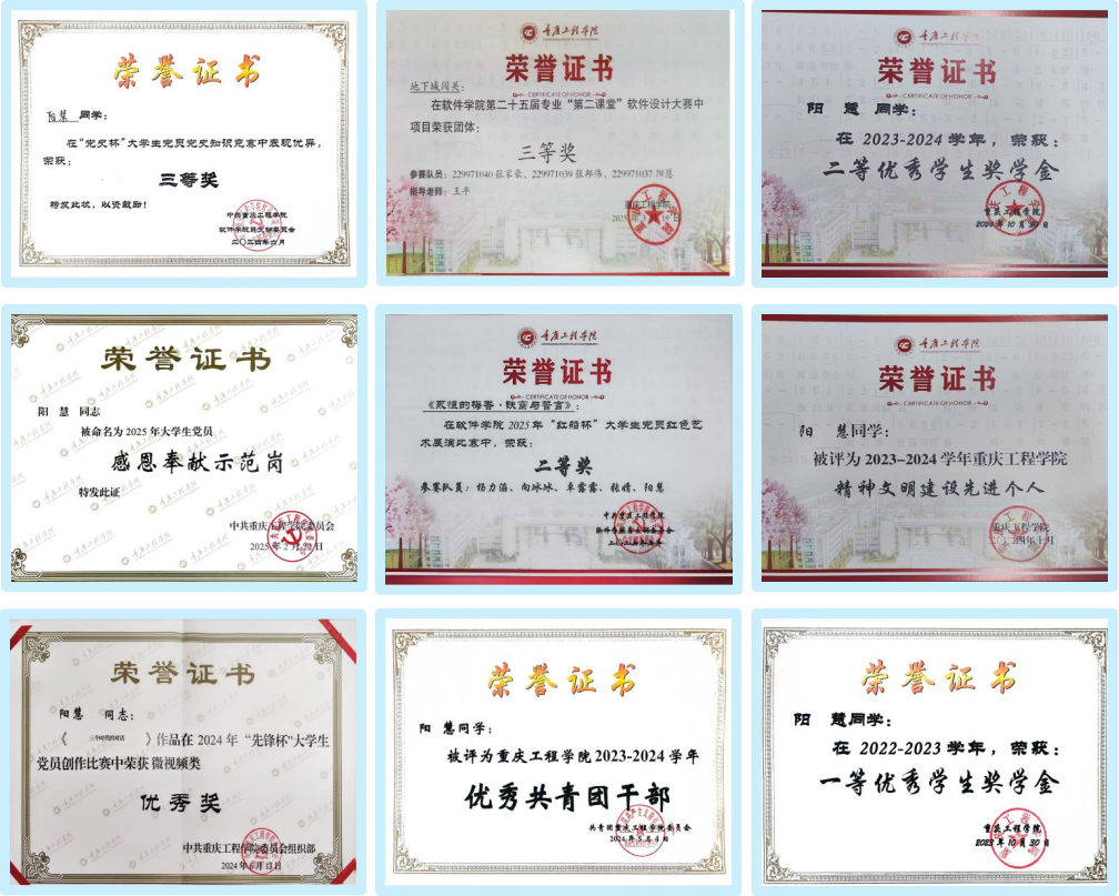 在学习方面,阳慧展现出积极进取的学习态度与扎实的专业积累,积极参与专业比赛如大广赛等,申报软著5项,且连续三年获得校优秀学生奖学金及第二课堂“三等奖”,考取英语四级证书。