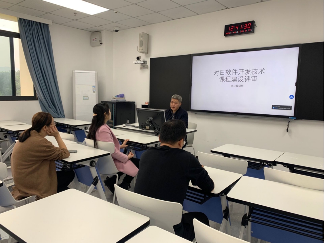 会上,皮少华老师首先介绍了《对日软件开发技术》课程建设的成果,阐述了课程建设的思路,分享了课程建设资源和课程教学大纲,教学进度计划表、教案、课件等常规教学资源。